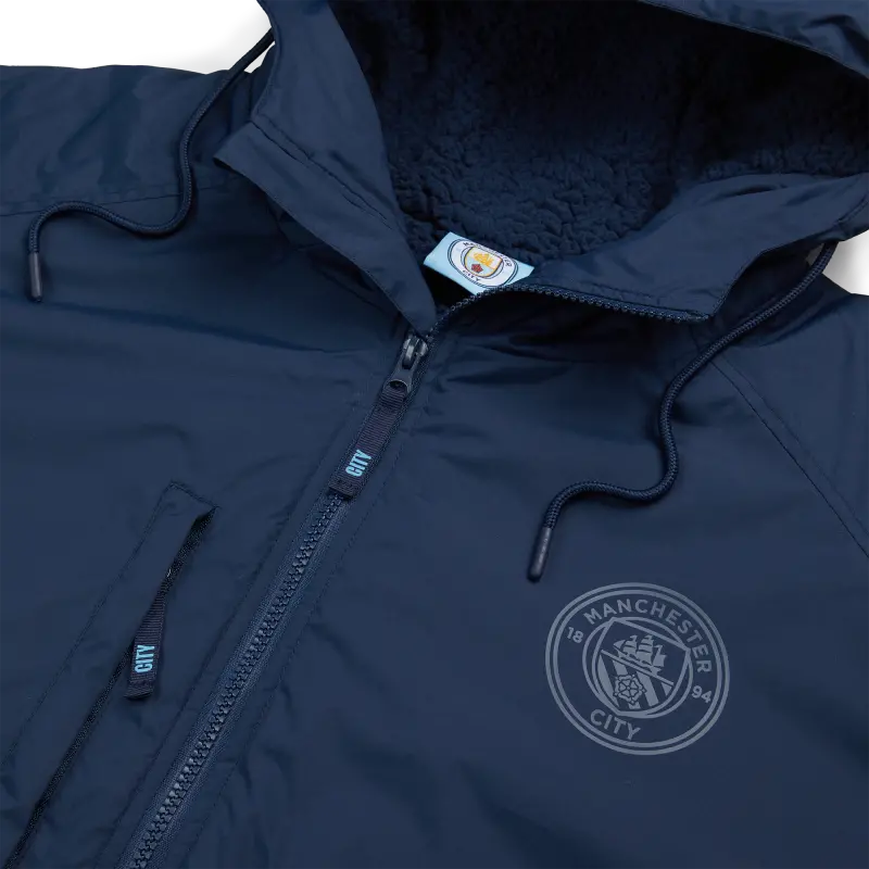 Der Kinder Manchester City Waterproof Changing Robe verfügt über ein komplett fleecegefüttertes Design mit mehreren Taschen, Kapuze mit Kordeln und Vereinswappendetails – perfekt, um junge Fans nach Aktivitäten warm und trocken zu halten.