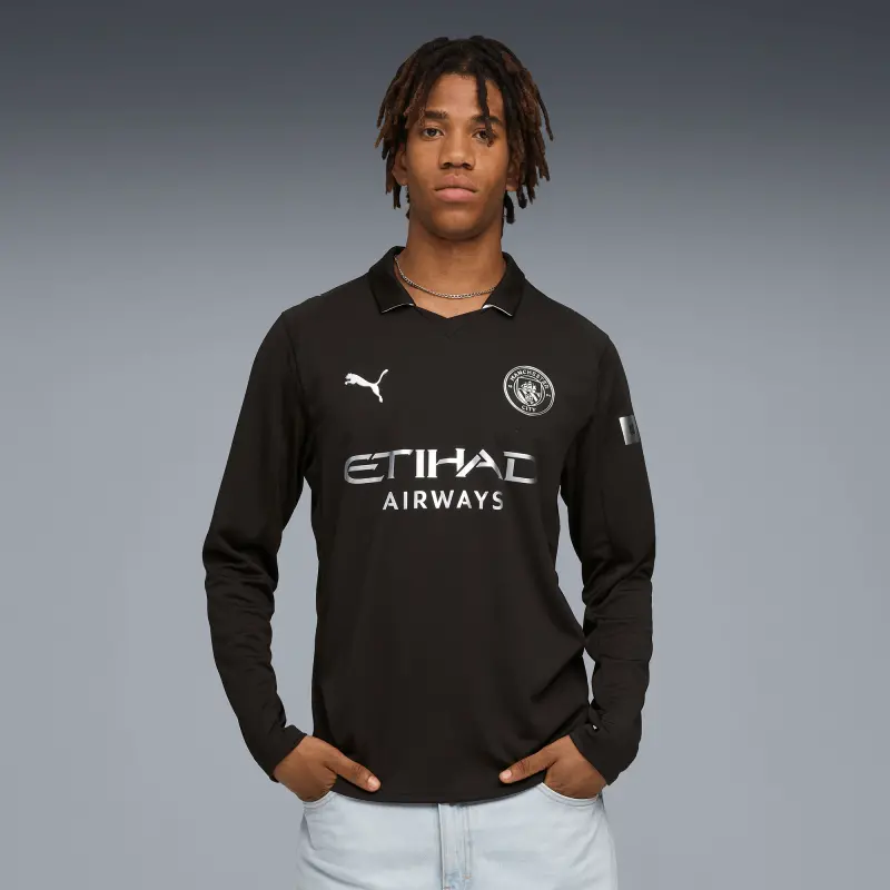 Das Manchester City Auswärtstrikot mit langen Ärmeln 2025/26 vereint auf eindrucksvolle Weise das reiche Erbe des Clubs mit moderner Leistung. Inspiriert von den Ursprüngen von Manchester City in Gorton, interpretiert das 25/26-Auswärtstrikot das erste bekannte Trikot des Clubs aus dem Jahr 1884 mit einem mutigen, komplett schwarzen Design und metallischen Details neu, die die Vergangenheit in die Gegenwart holen. Dieses Trikot ist eine Hommage an die ersten Cityzens. Für Komfort und Performance entwickelt, verfügt es über dryCELL-Schweißableitungstechnologie sowie atmungsaktive Mesh-Einsätze an Schultern, Seiten und unter den Armen, um dich kühl und trocken zu halten. Die reguläre Passform und langen Ärmel sorgen für ganztägigen Tragekomfort, während das offizielle Manchester City-Wappen und die PUMA Cat-Logos das Design stilvoll abrunden. Zeitlos, minimalistisch und kraftvoll – das ist das neue Auswärtstrikot von Manchester City.