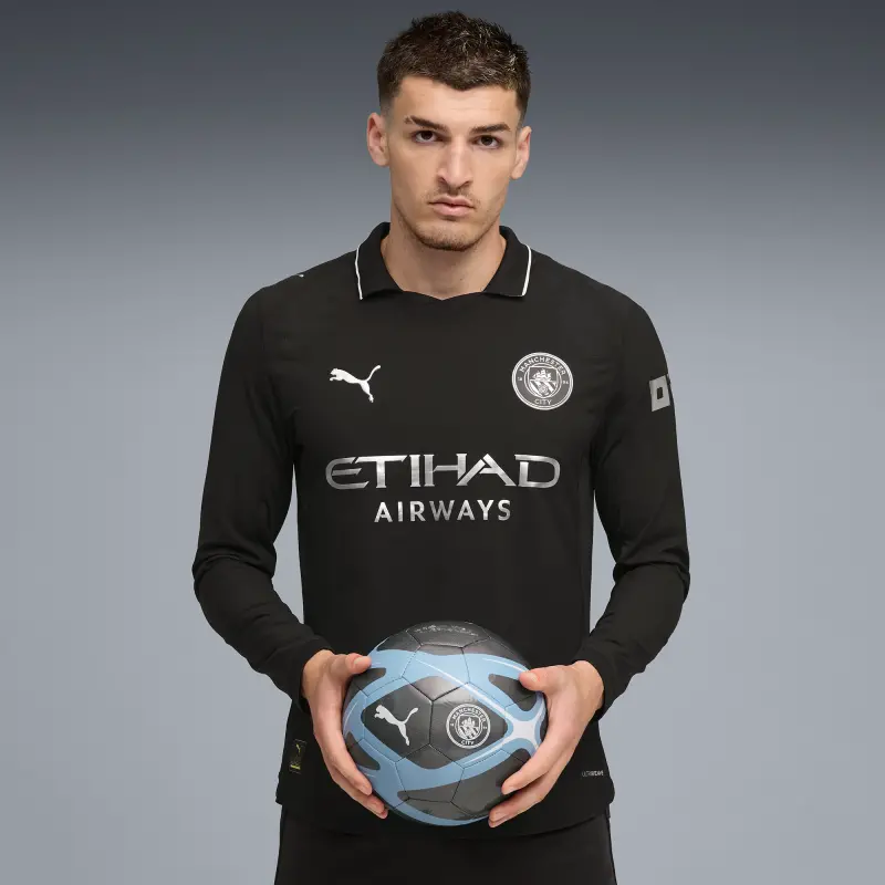 Feiere Tradition und Innovation mit dem Manchester City Authentic Away Langarmtrikot 2025/26. Inspiriert vom Ursprung des Vereins in Gorton, interpretiert dieses Auswärtstrikot der Saison 25/26 das erste bekannte Trikot von 1884 mit einem mutigen komplett schwarzen Design und metallischen Details, die Vergangenheit ins Heute holen. Eine Hommage an die ersten Cityzens – dieses Set markiert den Beginn eines neuen Kapitels: zeitlos, kraftvoll und geschichtsträchtig. Für Leistung konzipiert, verfügt das Trikot über leichtes ULTRAWEAVE-Gewebe und dryCELL-Technologie, die dich kühl und komfortabel hält. Mesh‑Einsätze an Schultern, Seiten und Achseln verbessern die Atmungsaktivität, während lasergeschnittene Details auf der Brust eine hochwertige Note setzen. Abgerundet mit Manchester City-Wappen, PUMA Cat Logos und einem Authentic Licensed Product‑Label mit 3D‑Hitzetransfer‑Mirage‑Effekt – ein Must‑have für echte Cityzens.