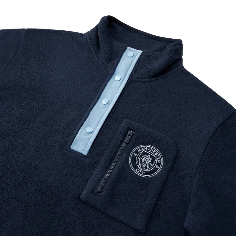 Der Manchester City Quarter Zip Fleece bietet gemütliche Wärme aus 300 g/m² Polyester-Mikrofleece mit gesticktem Wappen, Brusttasche und Handtaschen – ideal zum Layern mit Stolz.